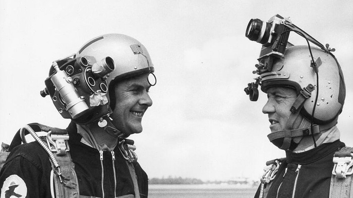 Dua anggota tim parasut Royal Air Force, The Falcons, Sersan Julien Tasker dan Sersan Penerbangan Terence Allen dilengkapi dengan kamera diam dan kamera film untuk memotret jatuhnya mereka di Abingdon Air Fair. Getty Images/Jim Gray Β