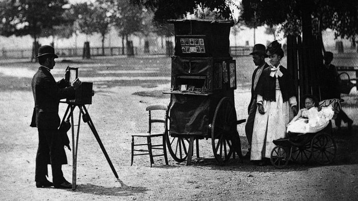 Seorang fotografer jalanan bekerja di Clapham Common, London, dengan stan keliling pada tahun 1877. Getty Images/John Thomson Β