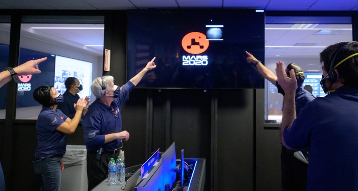 Kegembiraan tim Perseverance NASAΒ setelah mendapat konfirmasi bahwa pesawat luar angkasa tersebut berhasil mendarat di Mars. Foto: Bill Ingalls/NASA via AP