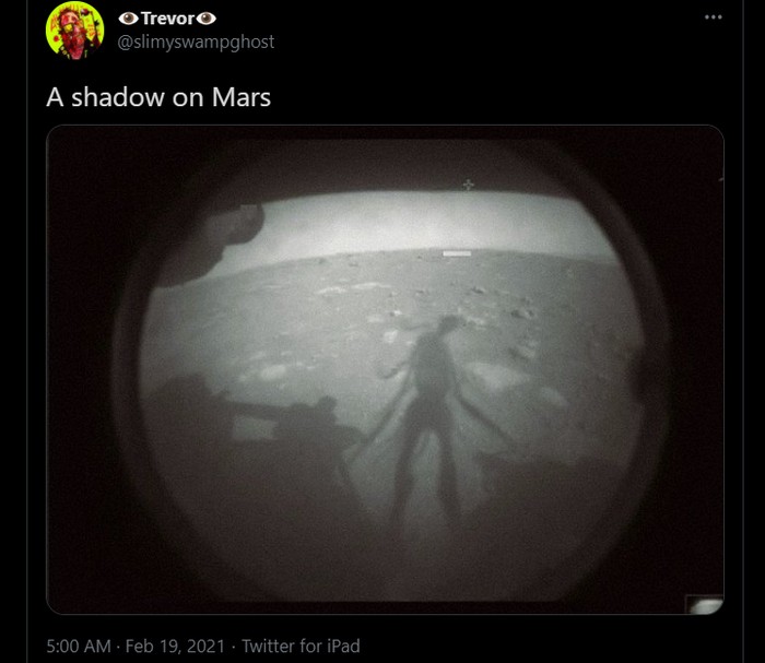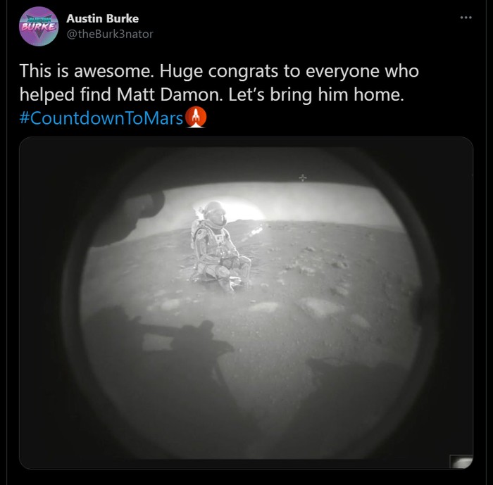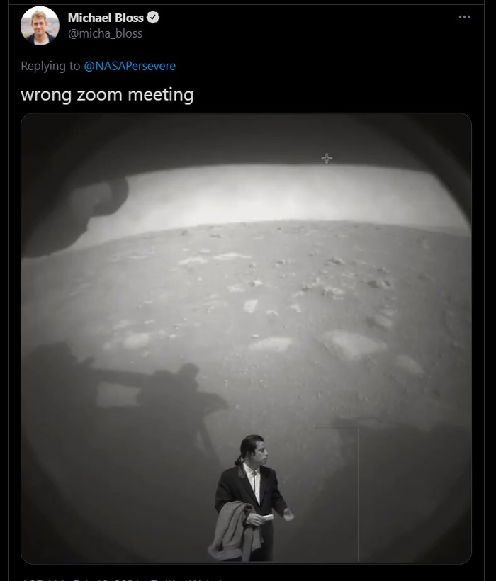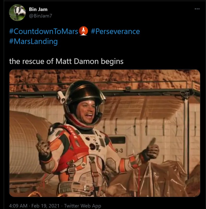 Foto-foto ini langsung dijadikan bahan meme kocak oleh netizen. Salah satunya meme Perseverance bertemu karakter yang diperankan aktor Matt Damon di film The Martian. Foto: Screenshot/Twitter