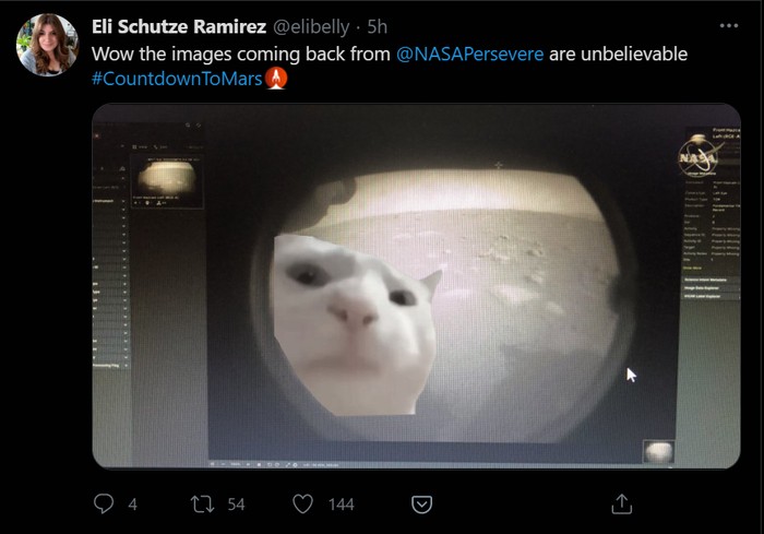 Meme vibe cat ikut joged-joged sambil mendengarkan lagu di Mars. Perlu diketahui, Perseverance membawa instrumen khusus yang bisa merekam suara lingkungan Mars untuk pertama kalinya. Foto: Screenshot/Twitter
