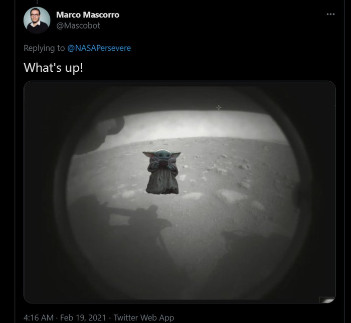 Baby Yoda menunggu dijemput Mando di Mars, eh malah ketemu Perseverance. Foto: Screenshot/Twitter