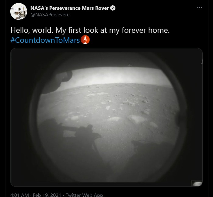 Ini adalah foto pertama yang diambil Perseverance setelah mendarat di Mars. Robot penjelajah ini tiba di tujuannya setelah menempuh perjalanan sekitar tujuh bulan. Foto: Screenshot/Twitter