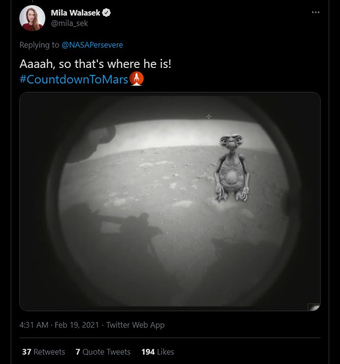Setelah meninggalkan Bumi, E.T. ternyata pulang ke Mars dan ketemu Perseverance. Foto: Screenshot/Twitter