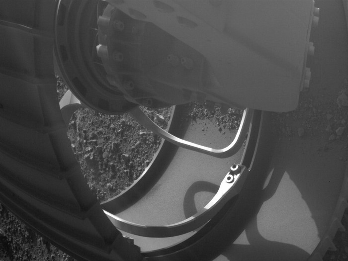 Tampak dalam foto hitam putih ini roda Perseverance dimasuki oleh debu Mars. Foto: NASA