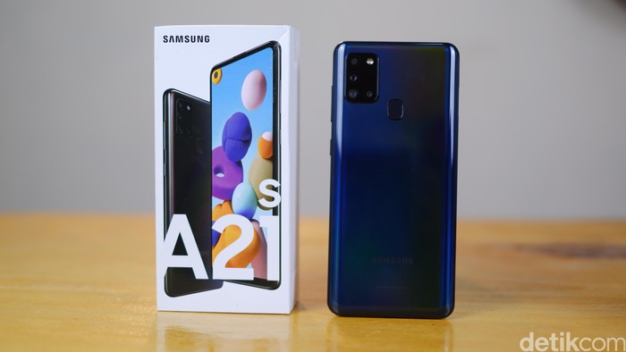 Layar Galaxy A21 berukuran 6,5 inch meski hanya beresolusi HD+. Ada empat kamera di belakang dan sudah sangat bagus untuk ponsel dengan range harga ini. Spesifikasi dan fitur lainnya termasuk penyimpanan 32 GB yang dapat di-upgrade, hingga baterai 4.000 mAh. Foto: Galih Prasetyo/detikINET