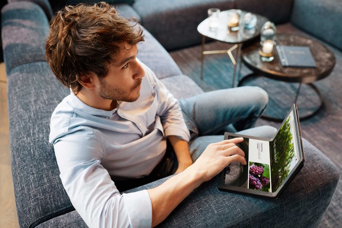 ThinkPad X1 Fold dilipat sebagian layaknya laptop pada umumnya. Nantinya secara otomatis layar bagian bawah akan berubah menjadi keyboard virtual. Foto: dok. Lenovo