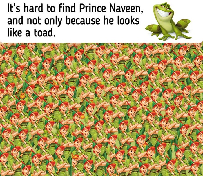 Agak sulit nih, bisa kamu menemukan pangeran Naveen di kumpulan para katak. Foto: Brightside