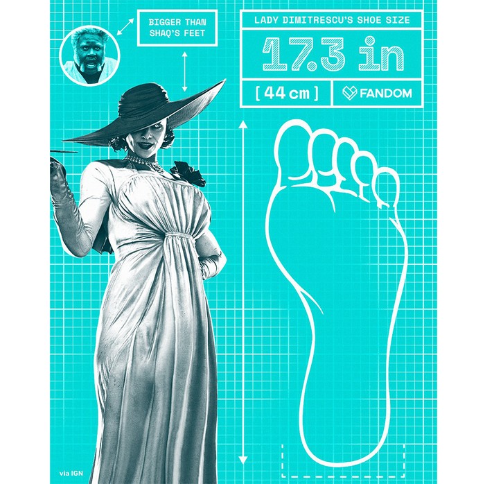 Seperti yang diungkapkan oleh Takano, ukuran sepatu dari Lady Dimitrescu hampir dua kali lipat ukuran sepatu wanita biasa yakni 17,4 inci (sekitar 44 centimeter). Foto: (Twitter : @getFANDOM).