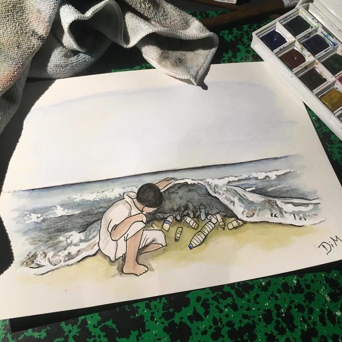 Moana kecil bermain dengan lautan penuh sampah plastik. (Foto: Boredpanda/@anthodraw)
