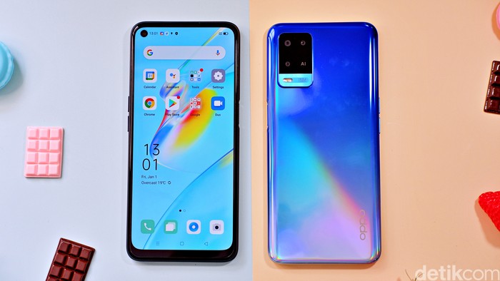 Oppo A54: Oppo A54 mengusung bentangan layar berukuran 6,51 inch dengan resolusi HD+ dan refresh rate 60Hz. Ia mengadopsi punch hole dan membuat rasio screen to body mencapai 89,2%. Tersemat tiga kamera di bagian belakangnya. Handset ini pun dibanderol Rp 2.699.000. Foto: Adi Fida Rahman/detikINET