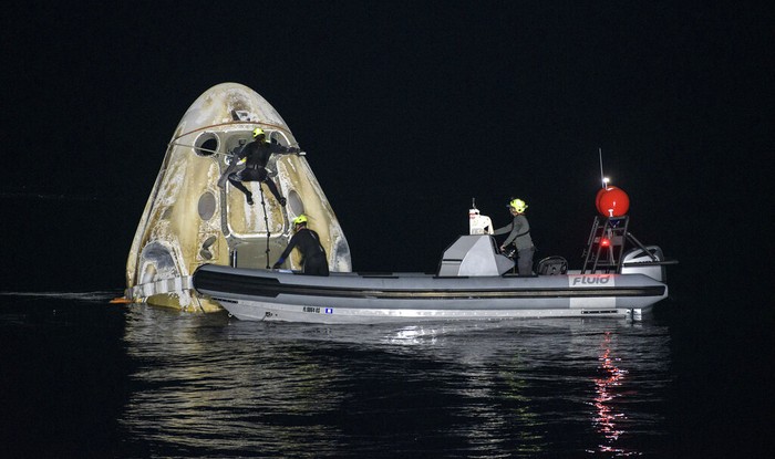 Kapsul Dragon mendarat dengan selamat setelah perjalanan singkat sekitar 6 jam. Ini adalah pertama kalinya pendaratan astronaut dilakukan pada malam hari setelah misi Apollo 8 di tahun 1960-an. Foto: AP