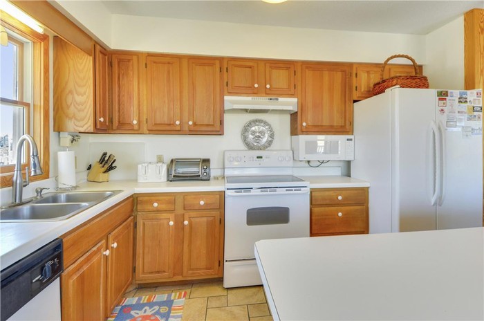 Dapur sederhana memiliki meja laminasi putih dan ubin krem. Foto: dok. TruPlace Premium Property Visual
