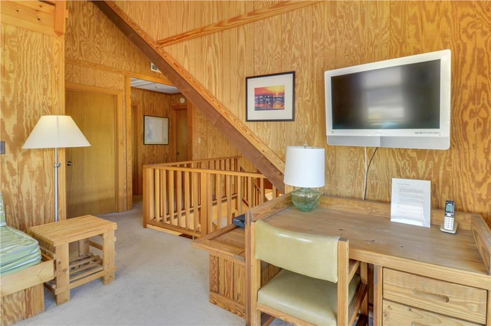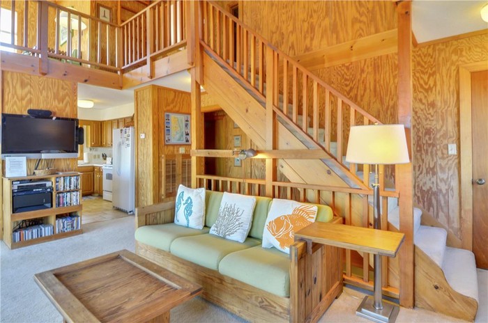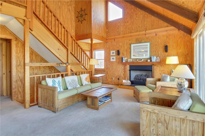 Ruang tamunya memiliki perapian kayu bakar dan tangga yang mengarah ke kamar tidur. Foto: dok. TruPlace Premium Property Visual