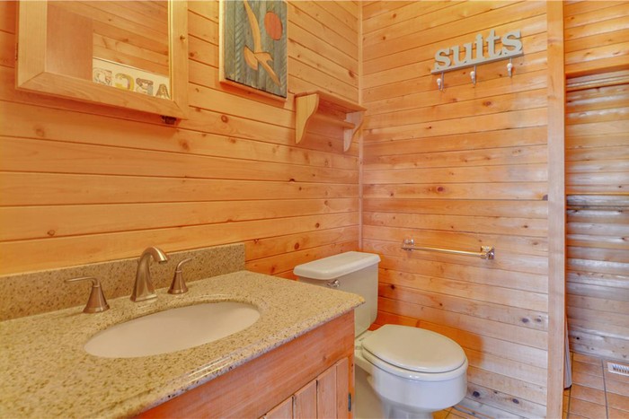Satu dari dua kamar mandi dengan dinding berpanel kayu. Foto: dok TruPlace Premium Property Visual