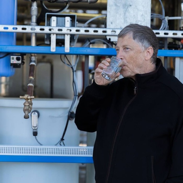 Saat minum air bersih hasil olahan kotoran manusia yang dihasilkan oleh mesin yang didanai yayasannya. Foto: Facebook