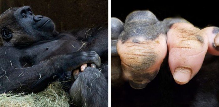 Gorila yang mengalami vitiligo pada jari tangannya. Jadi seperti jari manusia ya? Foto: Brightside