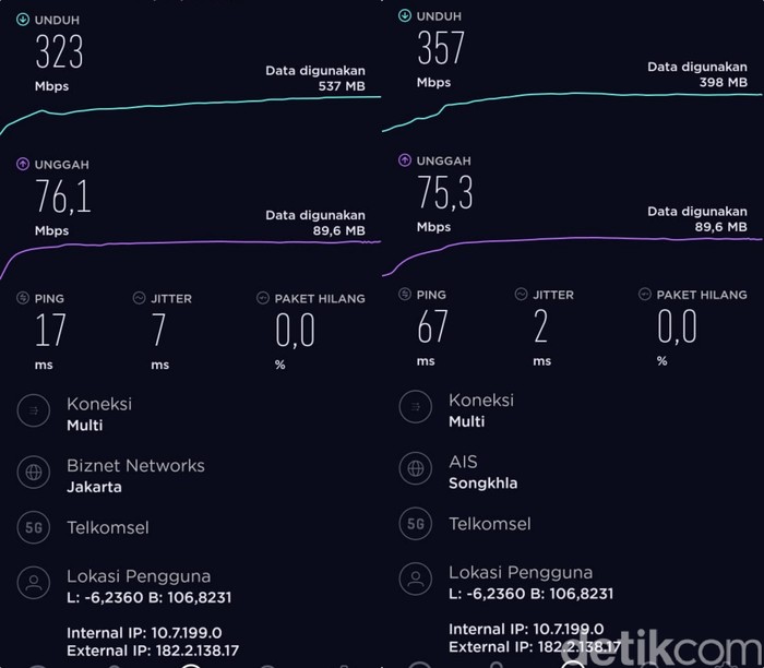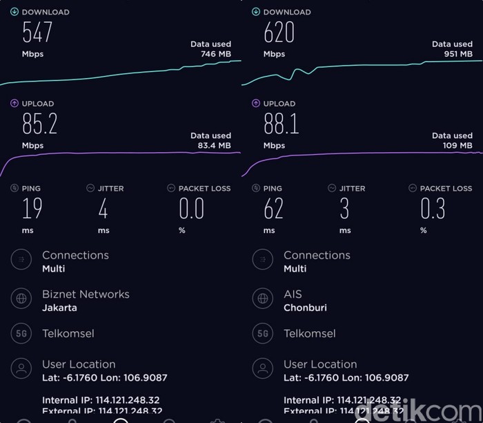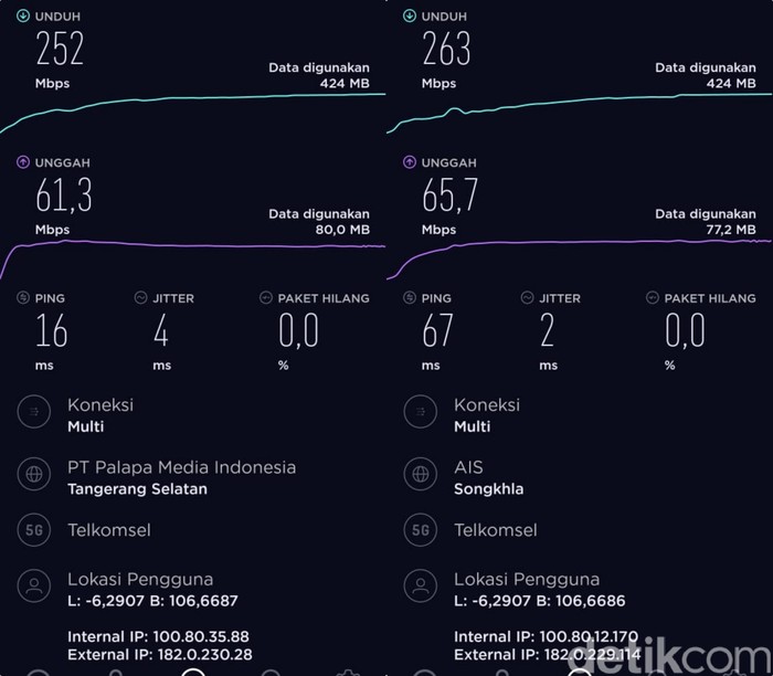 Perbandingan 5G (lokal) dan 5G (server luar negeri) di Pondok Indah. Foto: Adi Fida Rahman/detikINET Β Β