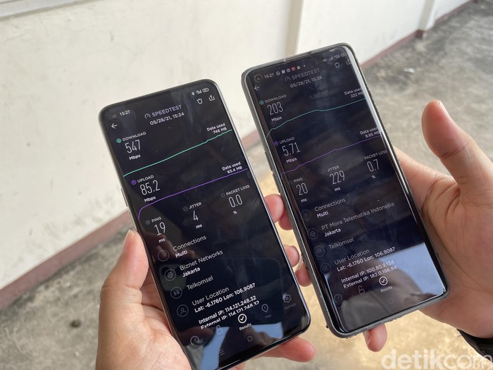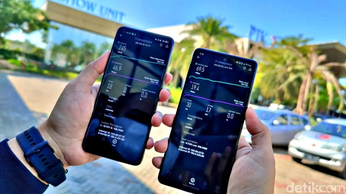 Perbandingan 5G (lokal) dan 5G (server luar negeri) di Pantai Indah Kapuk. Foto: Adi Fida Rahman/detikINET Β