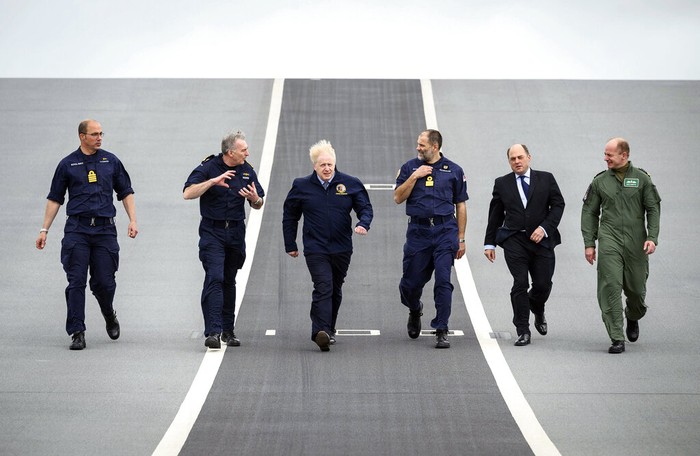 Sebelum keberangkatan HMS Queen Elizabeth, Perdana Menteri Inggris Boris Johnson melakukan kunjungan. Tampak ia berada di geladak kapal yang cukup luas bersama para petinggi militer Inggris. Foto: Associated Press