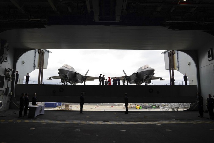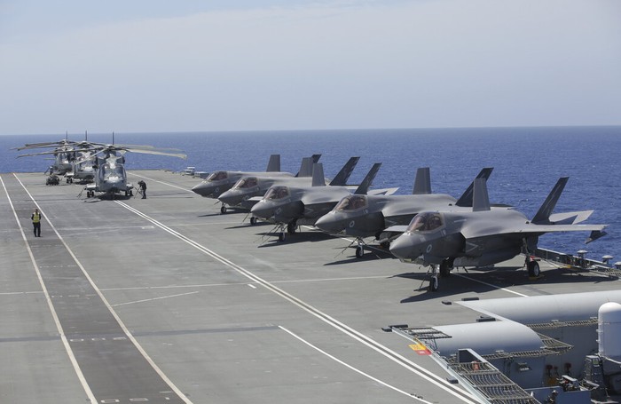 Kapal ini memiliki dek pendaratan seluas 16.000 meter persegi dan beratnya 65 ribu ton. Tampak F35B lepas landas. Foto: Associated Press
