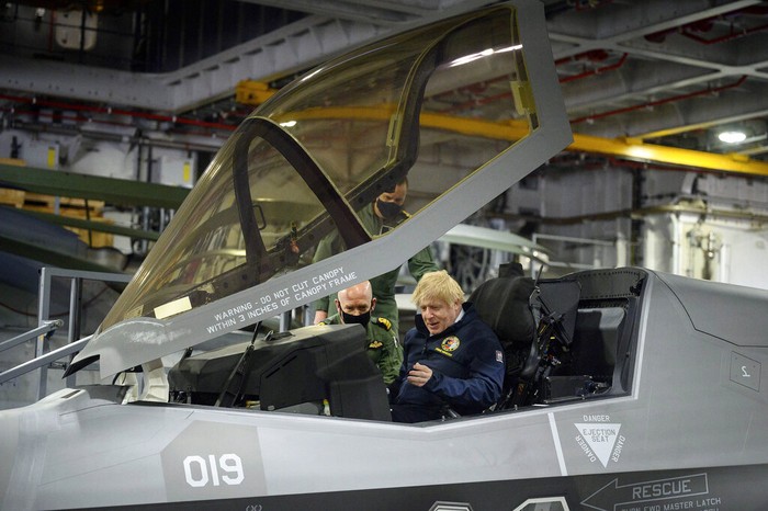 Boris Johnson menaiki jet tempur F35B yang berada di HMS Queen Elizabeth. Ia menyebut perjalanan kapal induk ini ke berbagai negara adalah perwujudan soft power Inggris Raya. Foto: Associated Press