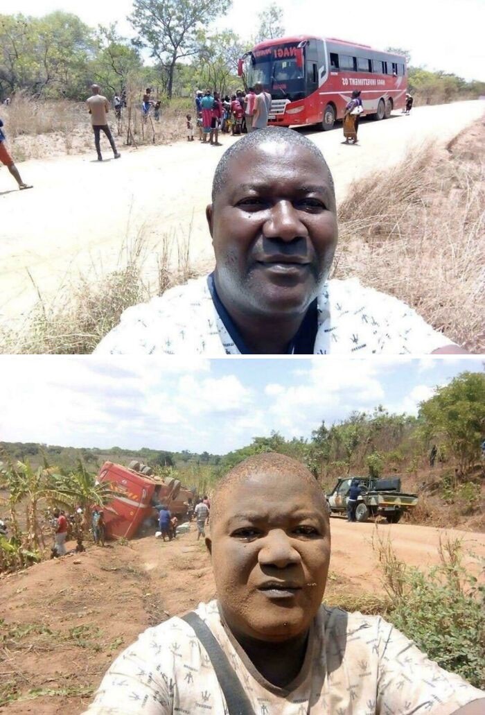 Tetap selfie walau busnya celaka dan wajahnya coreng moreng. Foto: Bored Panda