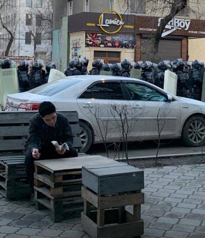 Santai saja baca buku di tengah pengamanan banyak polisi, mungkin ada aksi demo. Foto: Bored Panda