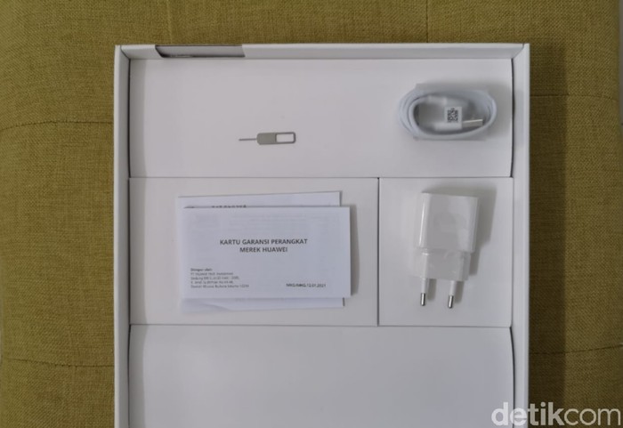 Kelengkapan lain di kemasan selain tabletnya adalah pengisi daya dan kabelnya, sim ejector serta kartu garansi. Foto: Fino/detikcom