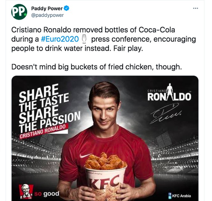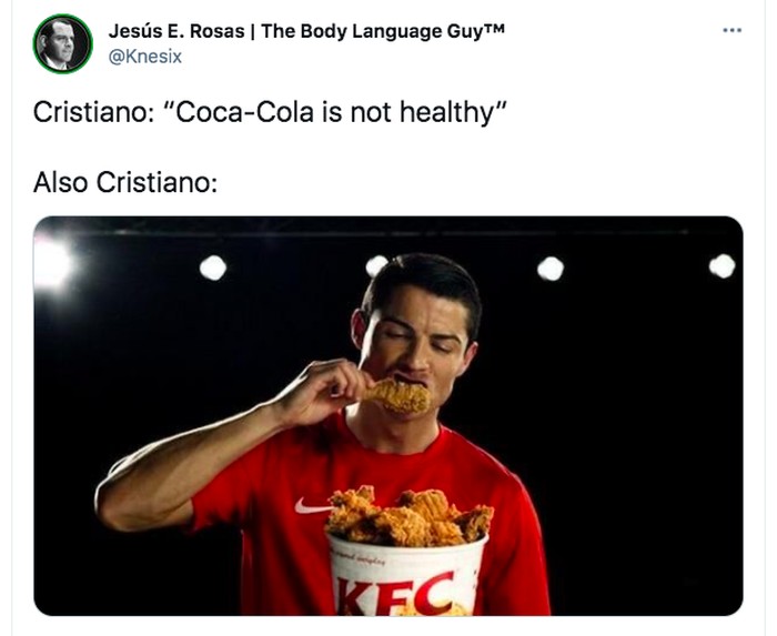 Padahal di sisi lain, Ronaldo adalah bintang iklan makanan cepat saji. Foto: Twitter