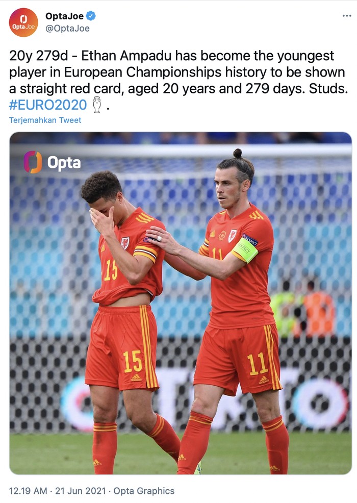 Catat rekor pemain termuda yang mendapatkan kartu merah di perhelatan Euro. Foto: Internet