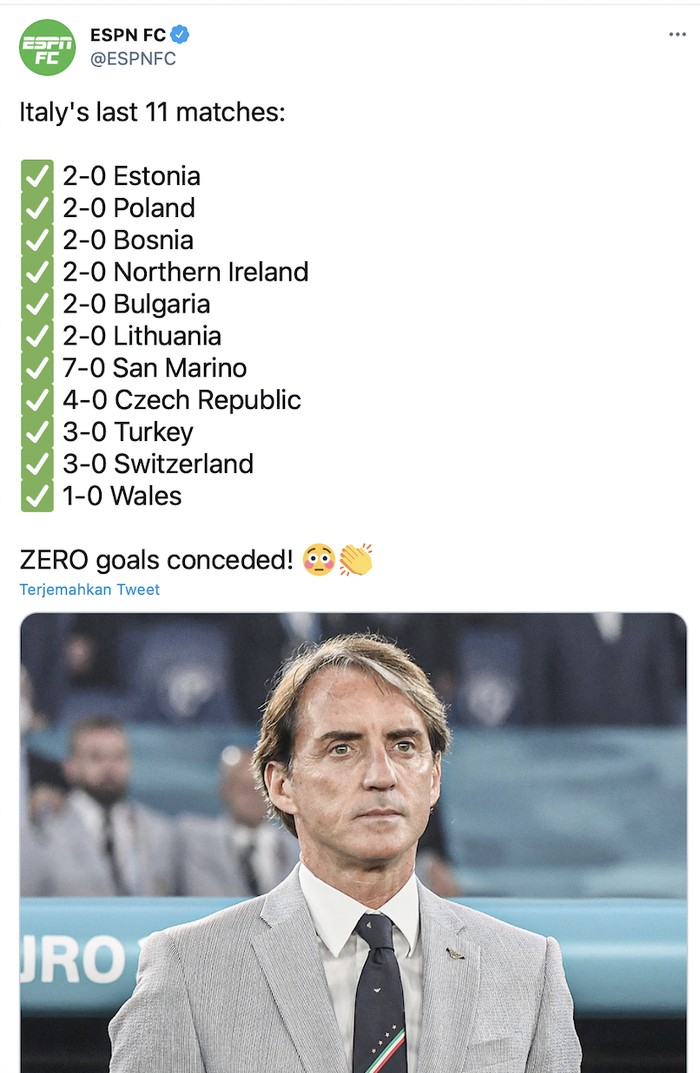 Bila melihat ke belakang, Italia sudah 11 kali pertandingan tanpa kebobolan. Foto: Internet