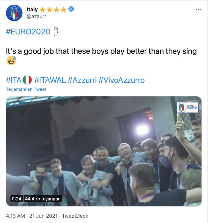 Euforia Italia masuk ke babak 16 besar. Para pemain nyanyi tapi tidak sebagus mereka bermain bola. Foto: Internet