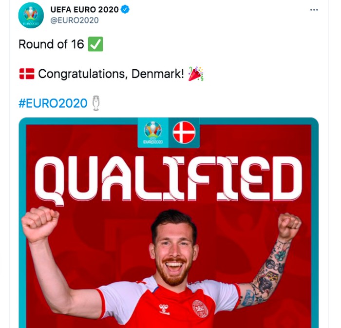 Selamat Denmark telah lolos ke babak 16 besar Euro 2020 dengan dramatis. Foto: Twitter