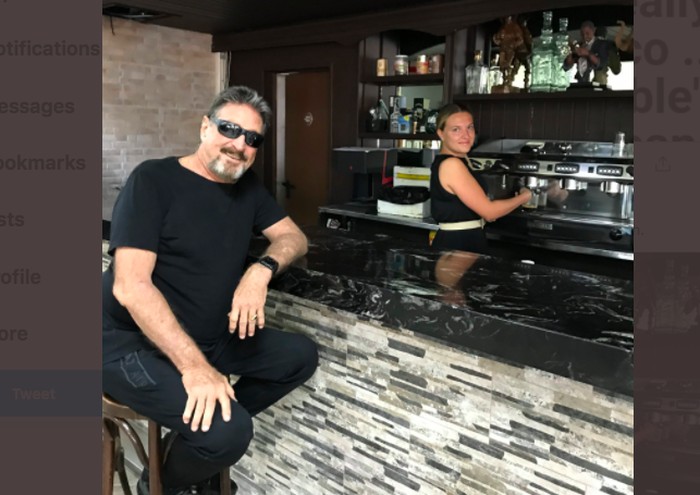 Pada Juli 2019, McAfee dan anggota rombongannya ditangkap saat kapal pesiarnya berlabuh di Puerto Plata, Republik Dominika, karena dicurigai membawa senjata dan amunisi berkaliber tinggi. Mereka ditahan selama empat hari sebelum dibebaskan. Foto: Twitter