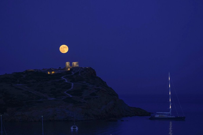 Strawberry full moon terlihat di candi Poseidon, sekitar 70 kilometer di selatan Athena. Ini adalah kemunculan supermoon terakhir di tahun 2021. Foto: Associated Press