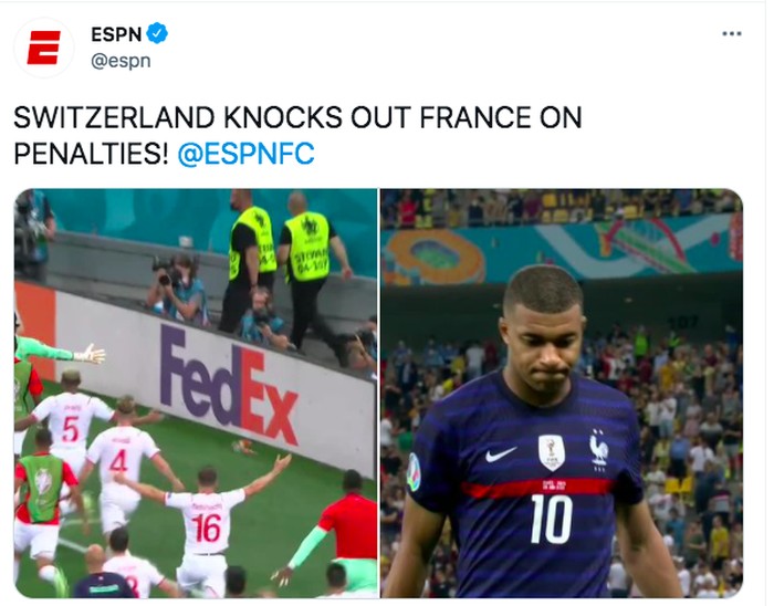 Swiss yang sama sekali tidak diunggulkan berhasil menumbangkan jagoan Prancis. Foto: Twitter