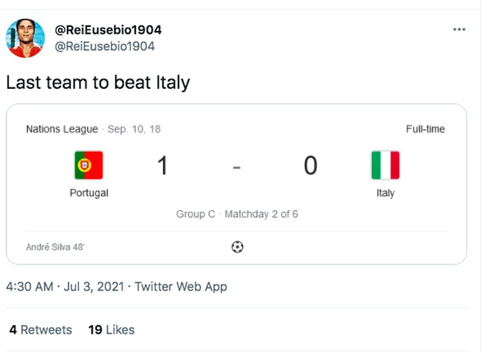 Sudah lama timnas Italia tidak kalah, terakhir kali di tahun 2018 oleh Portugal. Foto: Twitter