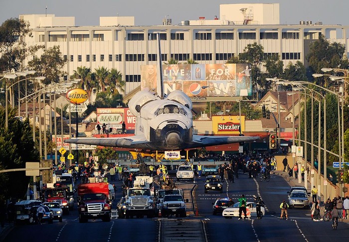 Arak-arakan Endeavour pada Oktober 2012 dari bandara Los Angeles International Airport (LAX) ke California Science Center yang disambut meriah oleh warga. Foto: Getty Images