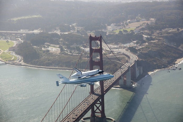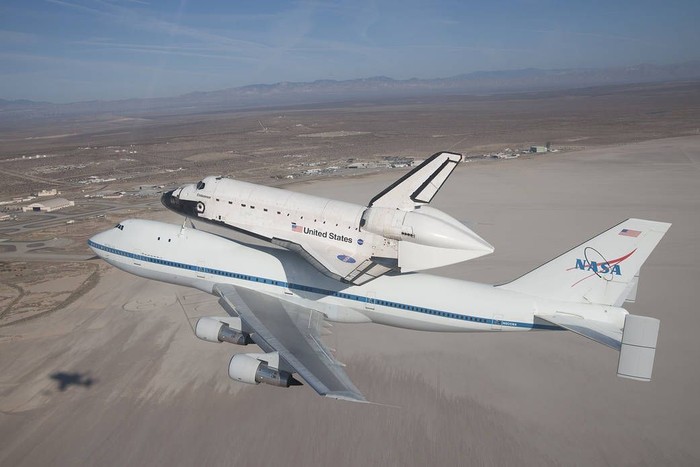 Untuk berpindah tempat, pesawat ulang alik semacam Endeavour diangkut dengan pesawat khusus dengan ditempatkan di bagian atas. Foto: Getty Images