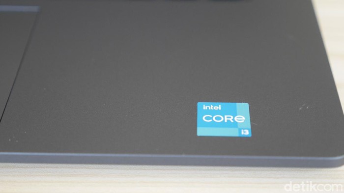 Sticker Intel Core generasi ke-11, yang menunjukkan kalau laptop ini menggunakan prosesor dari Intel, tepatnya Intel Core i3-1115G4, 2 core dan 4 thread. Foto: detikINET/Anggoro Suryo Jati