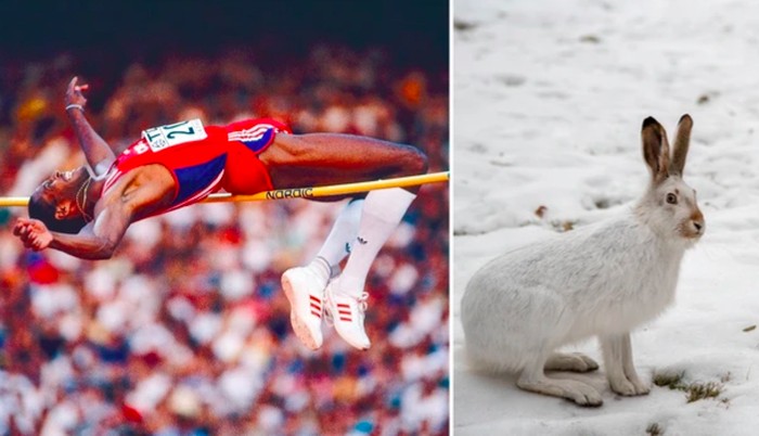 Lompatan tertinggi. Rekor manusia: 2,45 meter oleh Javier Sotomayor asal Kuba. Rekor hewan: 5,7 meter oleh kelinci ekor putih. Foto: Sciece Focus