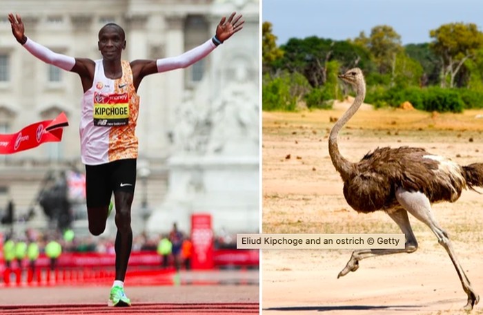 Pelari marathon. Rekor manusia: 2 jam 01 menit 39 detik oleh Eliud Kipchoge asal Kenya. Rekor hewan: 45 menit oleh burung unta.Foto: Sciece Focus