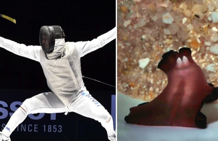 Anggar (Fencing). Rekor terbaik manusia dipegang oleh Daniele Garozzo asal Italia yang memenangkan medali emas di Olimpiade 2016. Rekor terbaik hewan oleh cacing pipih (flatworm) yang melakukan fencing dengan penis mereka.Β Foto: Sciece Focus