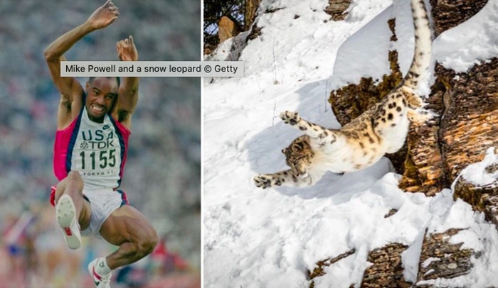 Pelompat terpanjang. Rekor manusia: 8,95 meter oleh Mike Powell asal AS. Rekor hewan: 15 meter oleh macan tutul salju (snow leopard).Β Foto: Sciece Focus