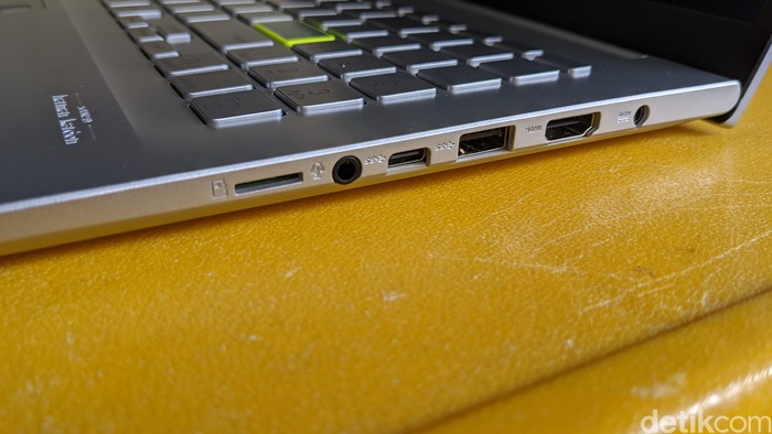 Deretan port di samping kanan laptop yang terdiri dari port charger, HDMI 1.4, jack audio 3,5mm, USB 3.2 Gen 1 Type-A, USB 3.2 Gen 1 Type-C dan slot card reader untuk microSD. Foto: Virgina Maulita Putri/detikINET