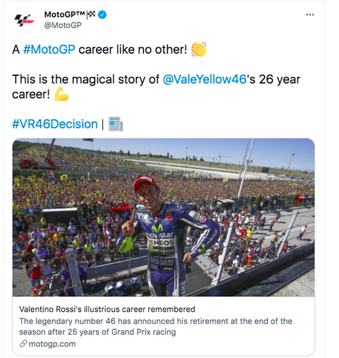 Akun resmi MotoGP pun sambung menyambung membahas mengenai kiprah Valentino Rossi. Foto: Twitter