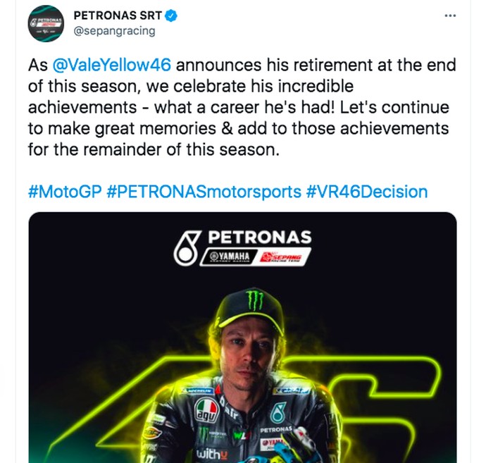 Petronas menyebut karir Valentno Rossi sungguh luar biasa. Foto: Twitter