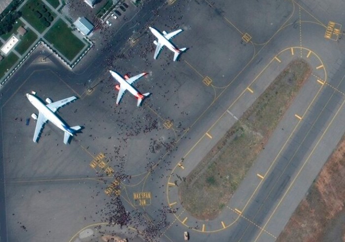 Landasa bandara dipenuhi dengan orang dari segala penjuru. Foto: AP/Satellite image Β©2021 Maxar Technologies
