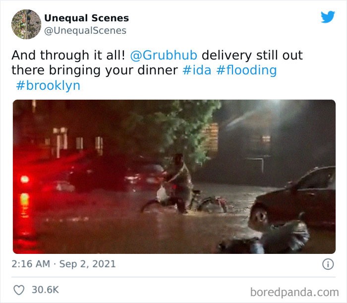 Tampak pengantar makanan masih bekerja di area banjir sekitar Brooklyn. Foto: Bored Panda